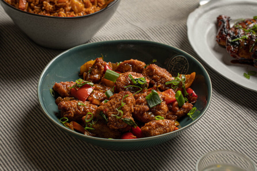 נתחוני עוף מצופים בטמפורה ברוטב צ’ילי מתוק וטריאקי.