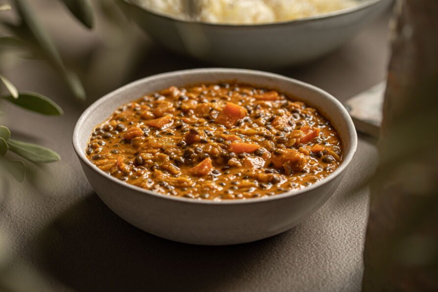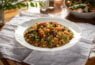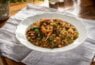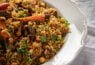 אורז בסמטי עם נתחי פרגית ובשר, גרגירי חומוס, גזר ובצל, בתיבול כמון.