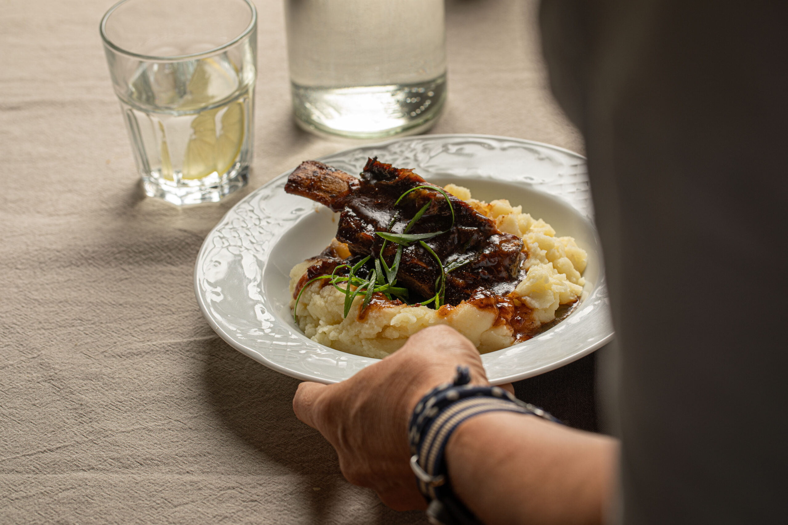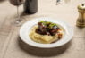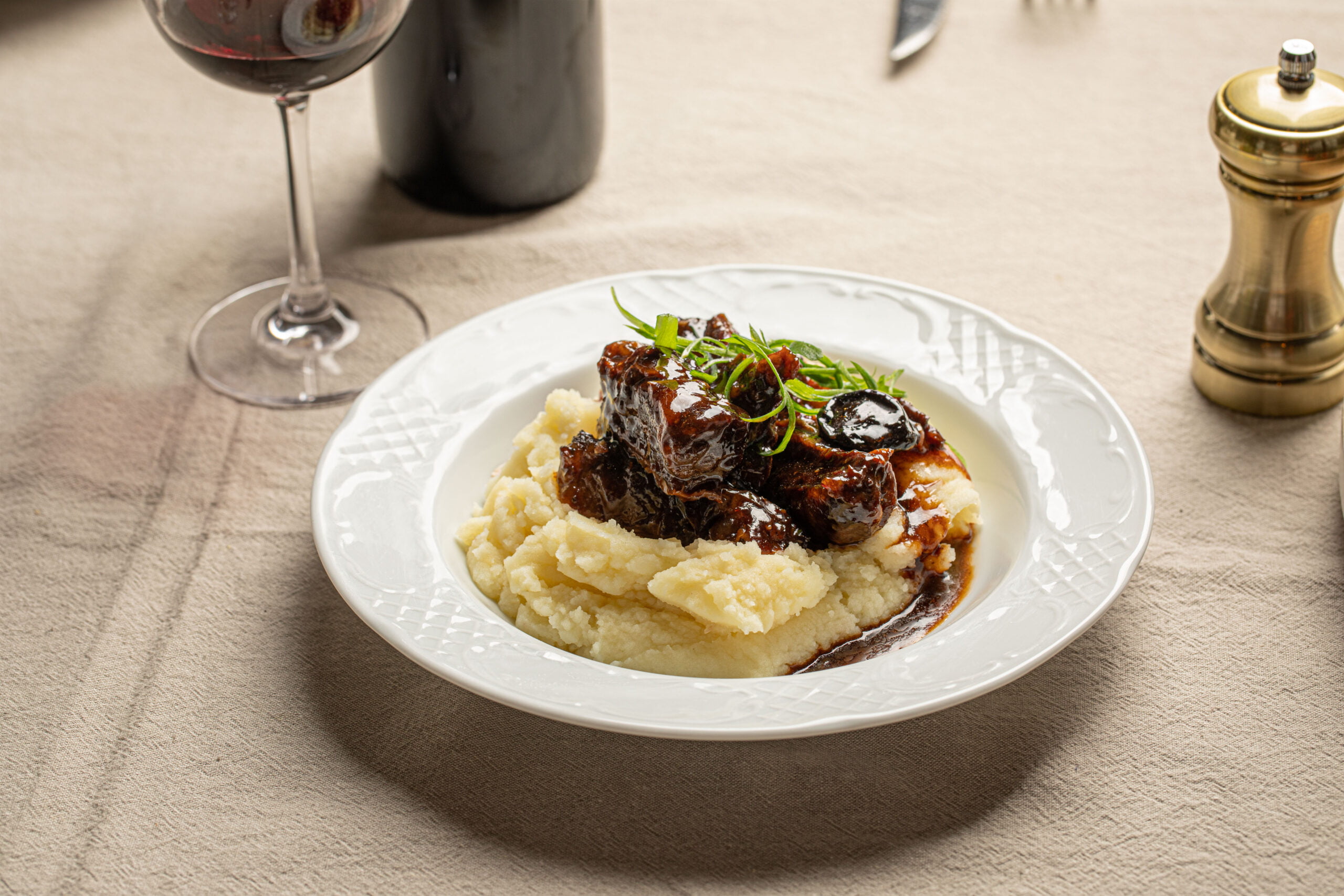 צלעות עגל ללא עצם, שבושלו ארוכות ברוטב יין אדום ושזיפים מיובשים. מנת להיט מתקתקה.