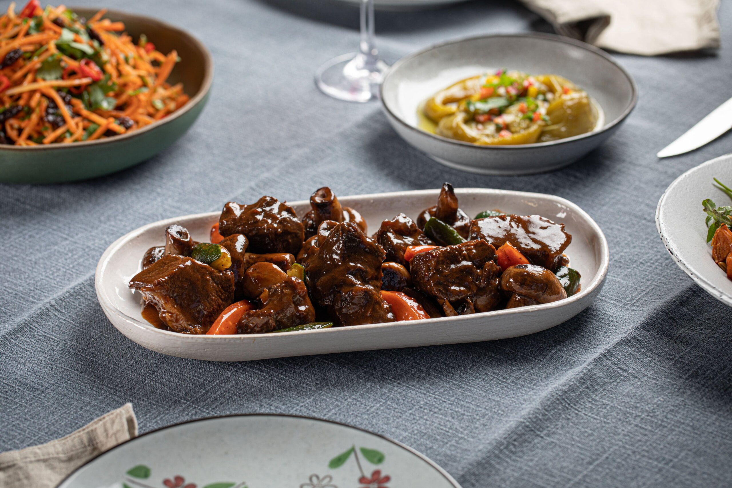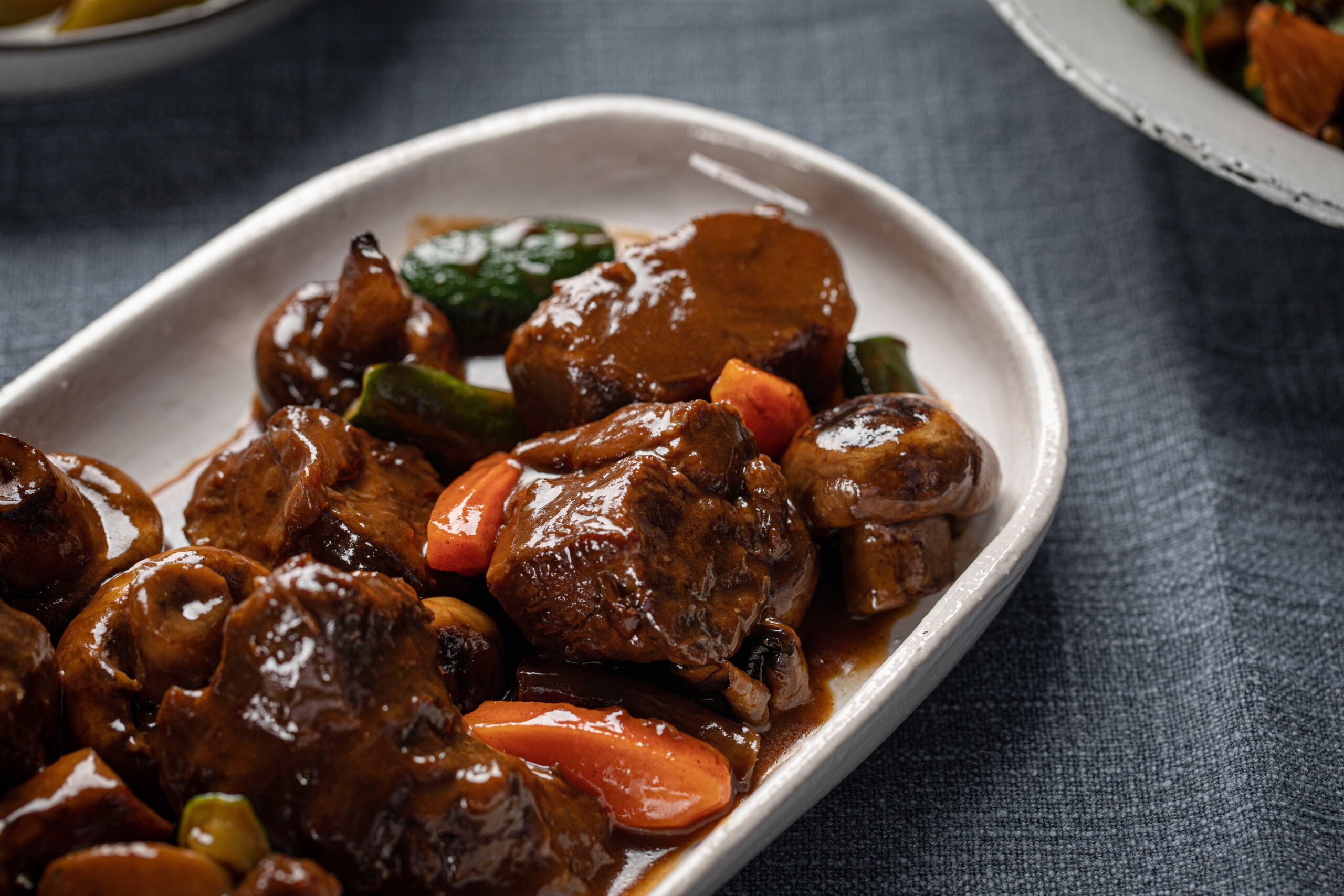קדירת קוביות בקר בבישול ארוך, עם יין אדום, תימין, גזר, סלרי ופטריות. הולך נהדר עם פירה.