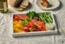 עגבניות שרי, לפל טינקרבל, רצועות גזר ומגוון ירקות גינה בהתאם למגוון העונה – חתוכים בדיוק במידה הנכונה. מוגש ברוטב ויניגרט הדרים.