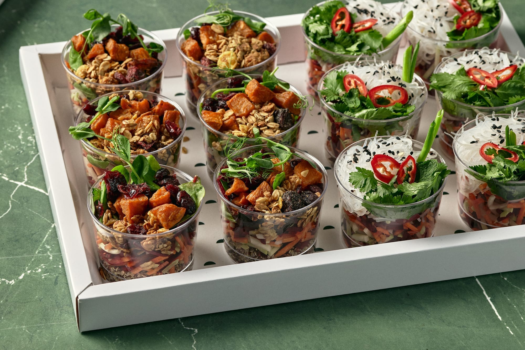 חצי עם סלט בריאות וחצי עם סלט אסיאתי ושני הסוגים משובצים בחומרי גלם טריים וטובים.