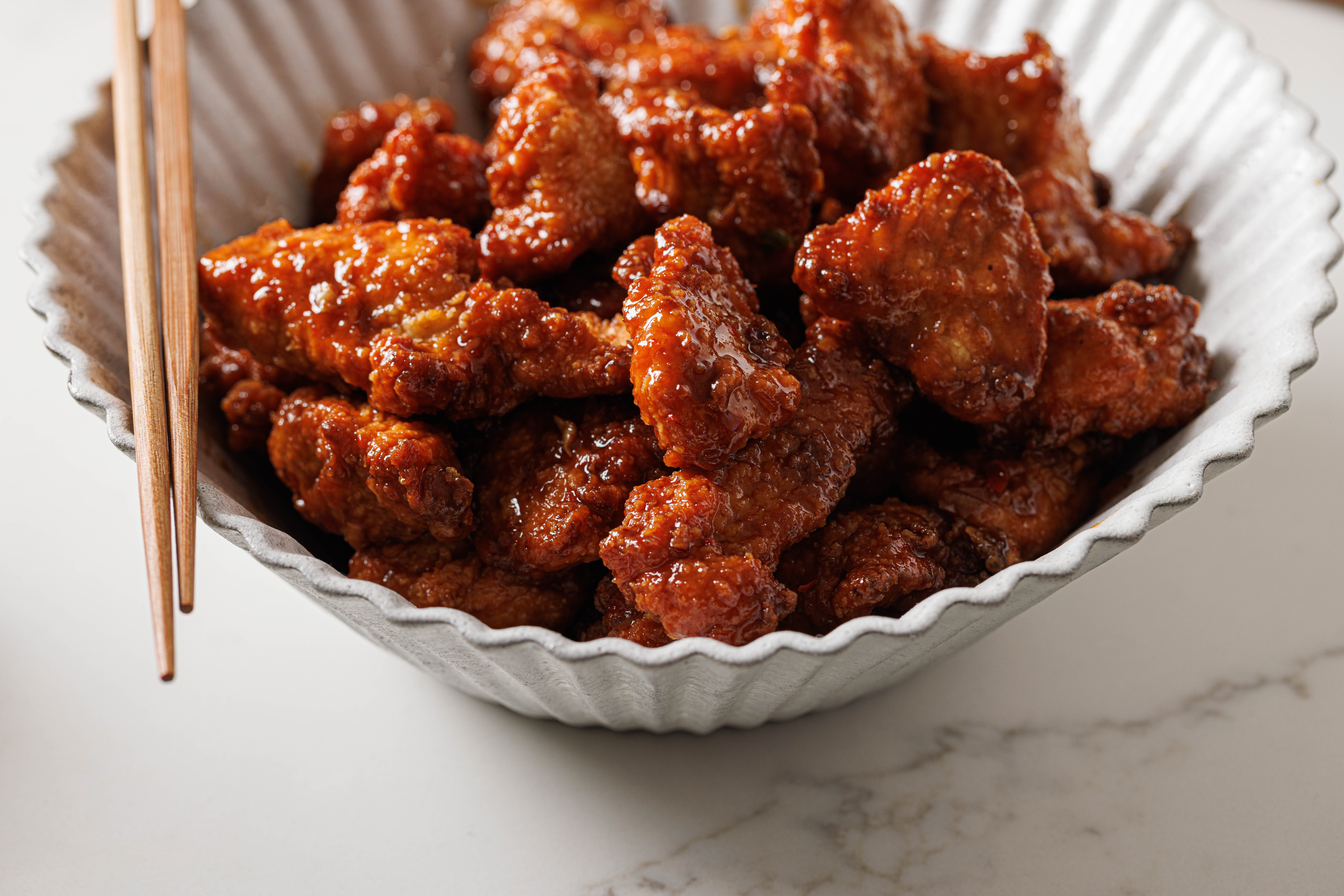 נתחוני עוף מצופים בטמפורה ברוטב צ’ילי מתוק וטריאקי.