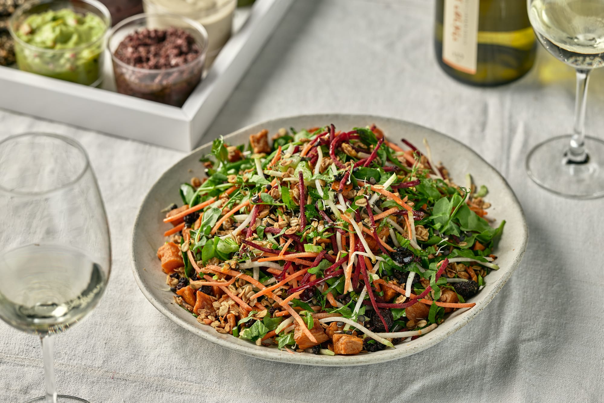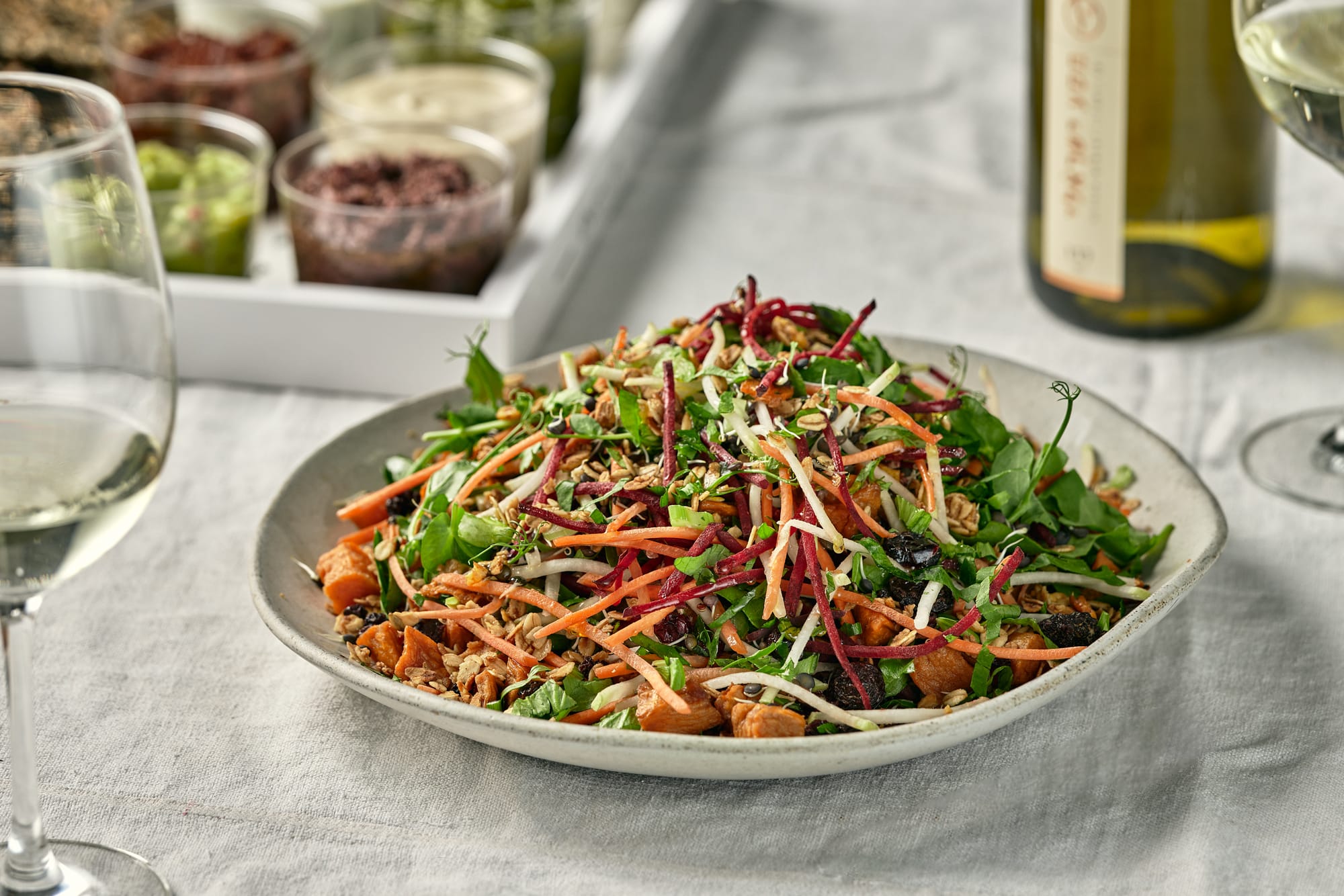 סלט עשיר ומעורר עם קינואה אדומה ולבנה, קוביות בטטה מטוגנת, פטרוזיליה קצוצה, סלרי, קוביות סלק, בצל ירוק, בייבי רוגלה ועדשים מונבטות.