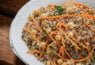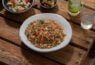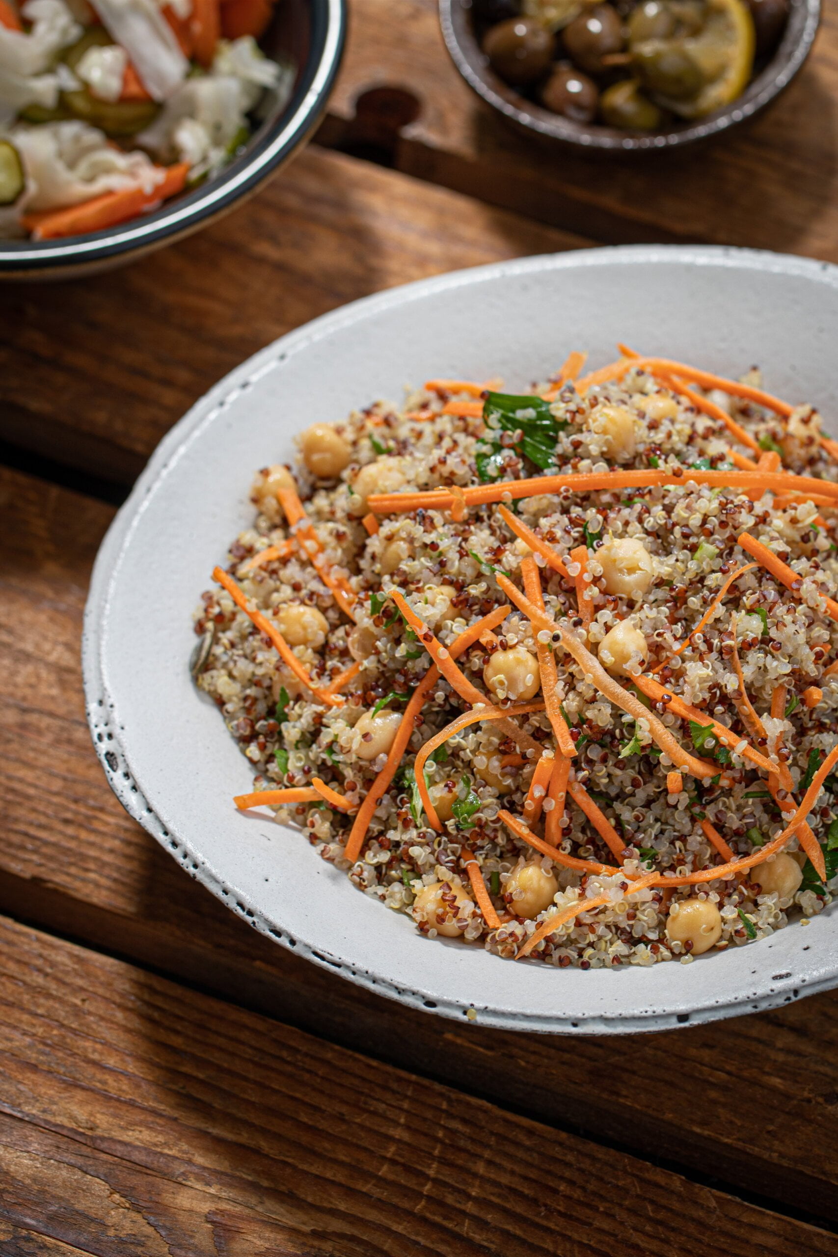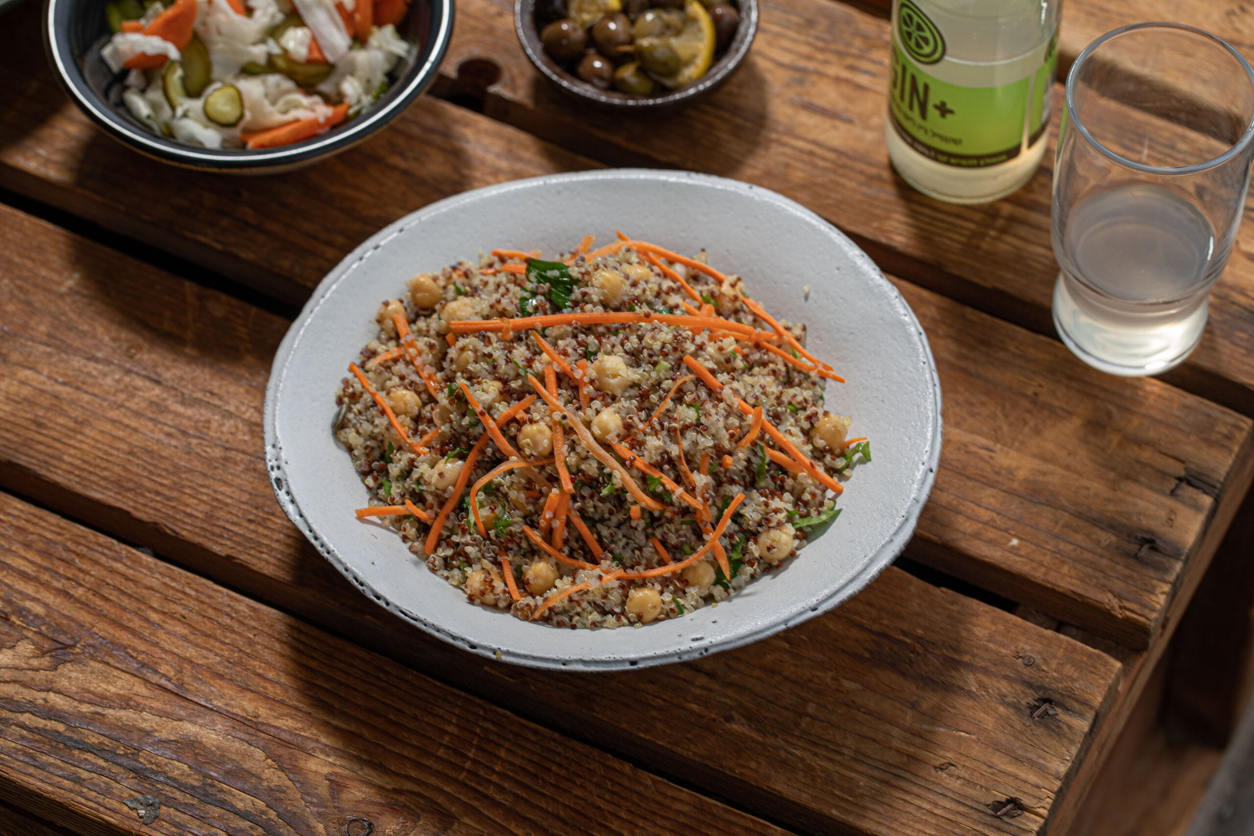 קינואה לבנה ואדומה עם ז’וליינים של גזר, גרגירי חומוס, עשבי תיבול, שמן זית ולימון.