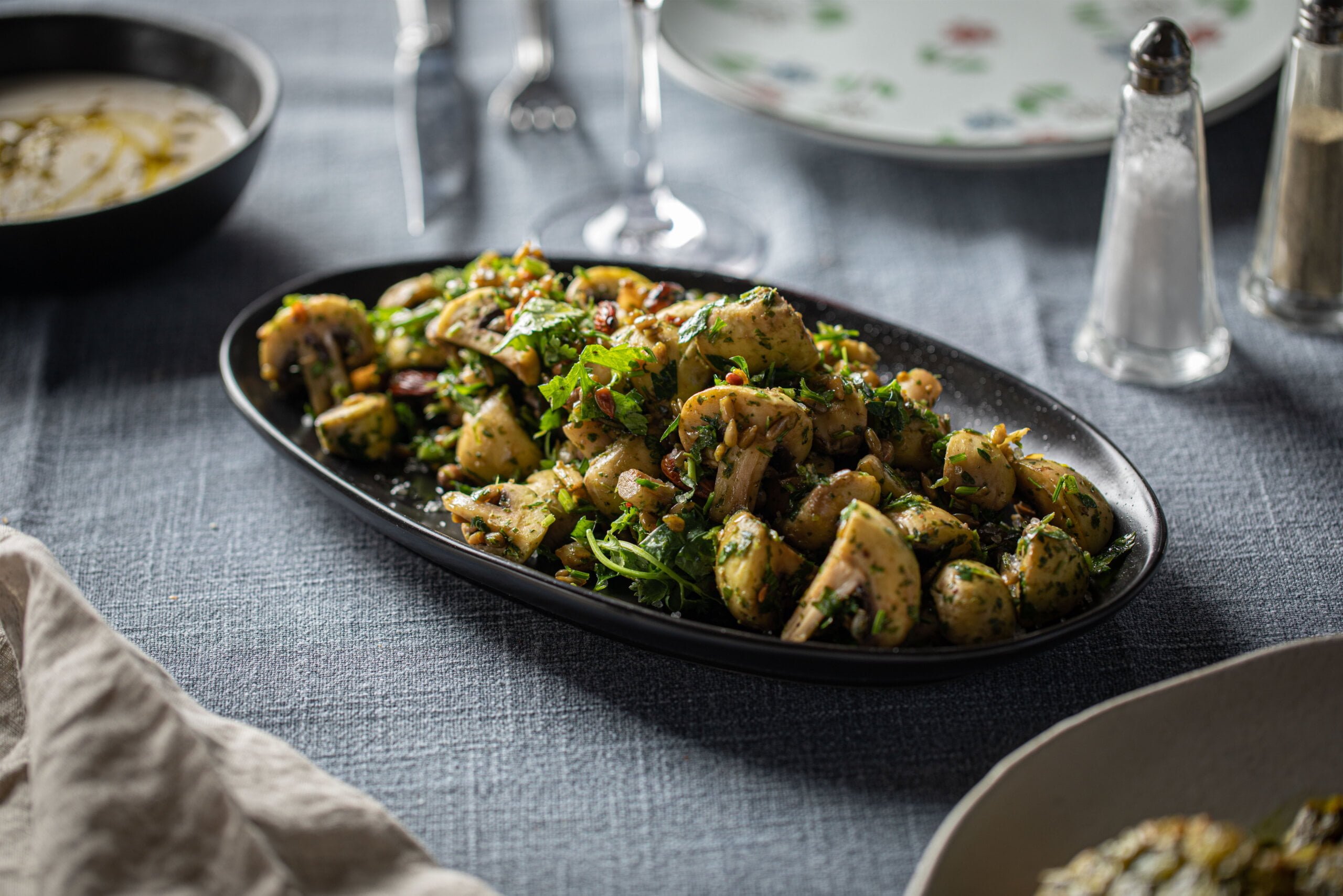 פטריות שמפיניון שלמות, מוקפצות בסויה וטריאקי.