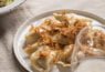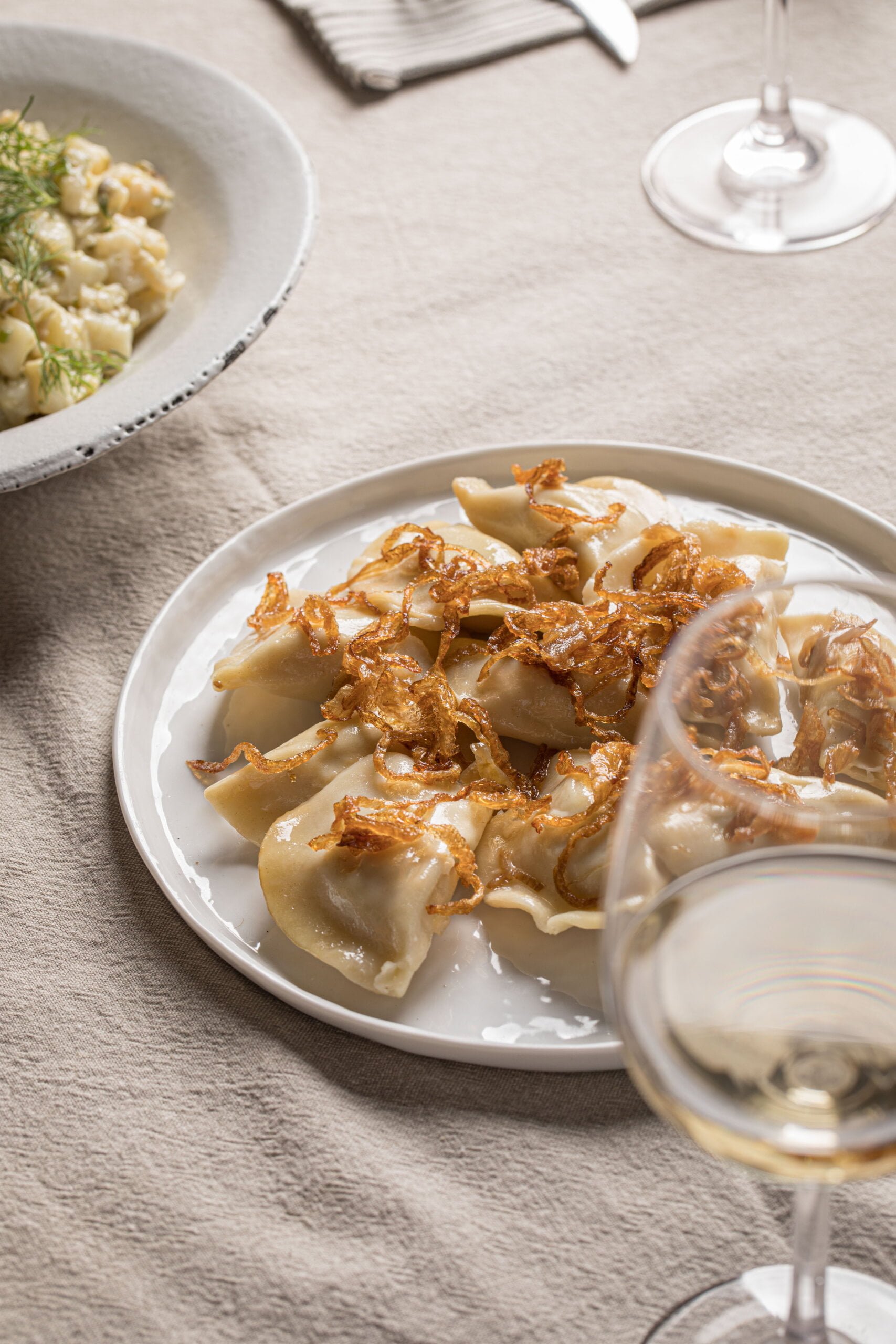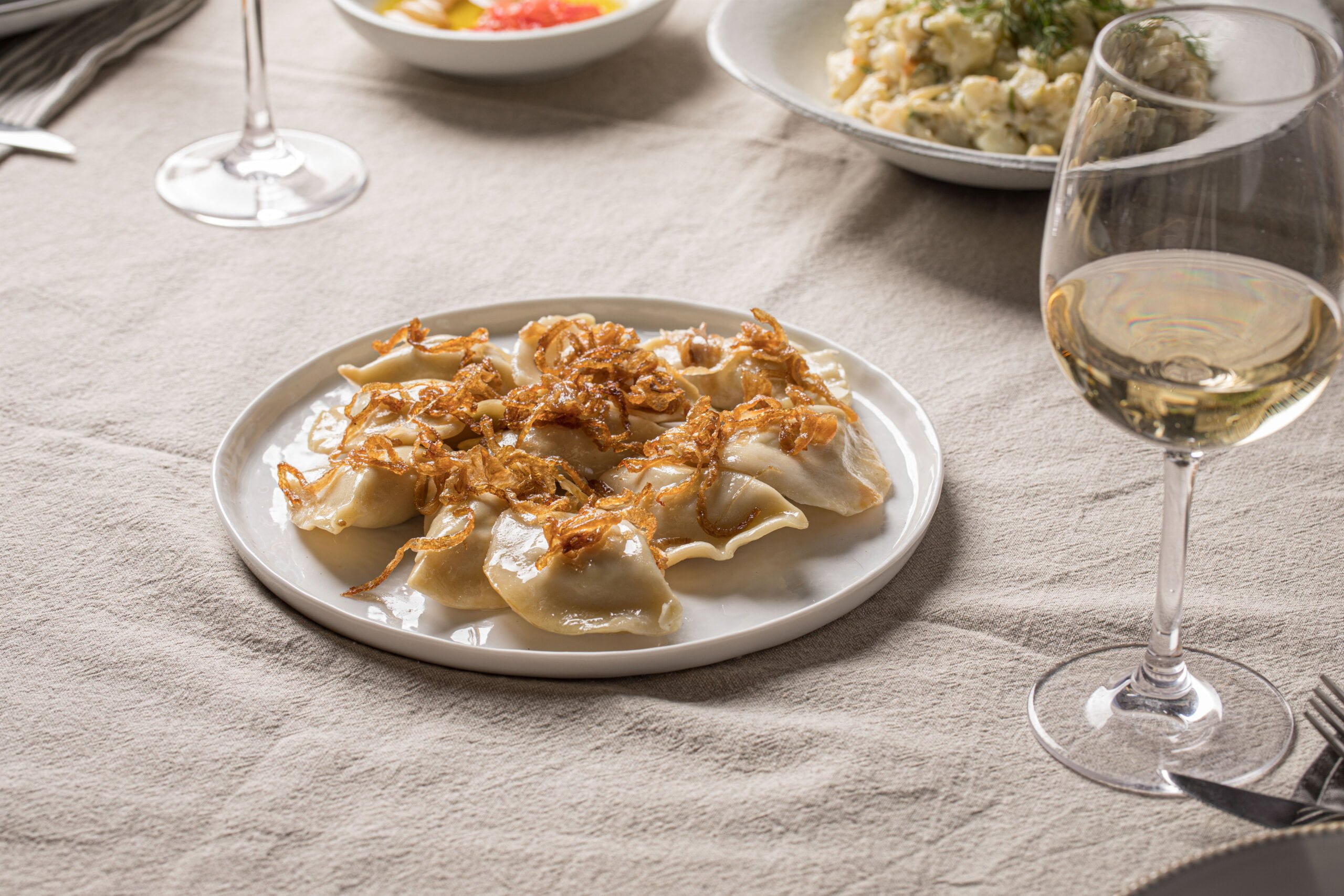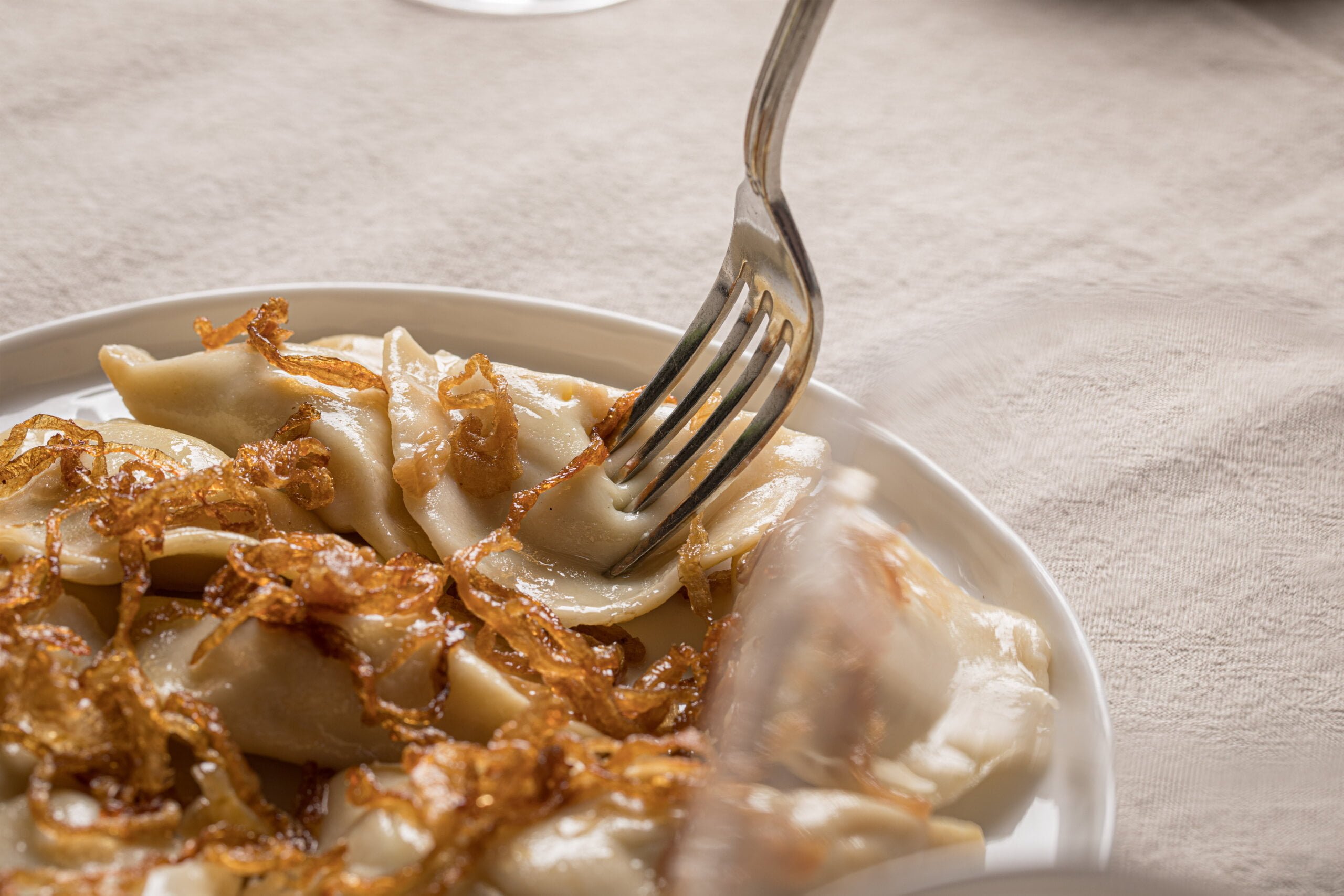 כיסונים ממולאים תפוחי אדמה, עם שפע של בצל מטוגן ושחום.