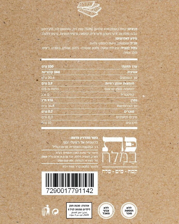 הם מיוצרים בעבודת-יד מקמח כוסמין מלא, חומוס וחומרי גלם איכותיים נוספים.