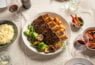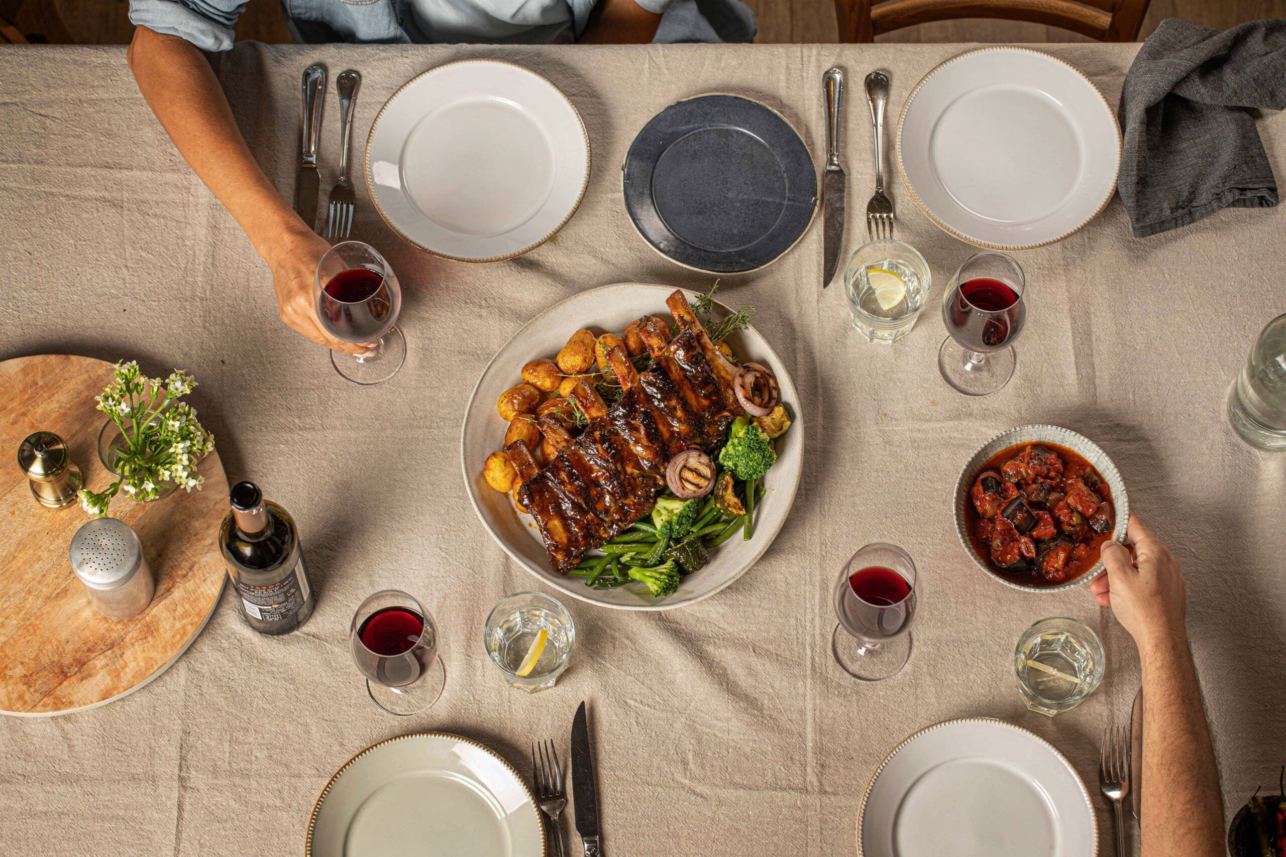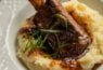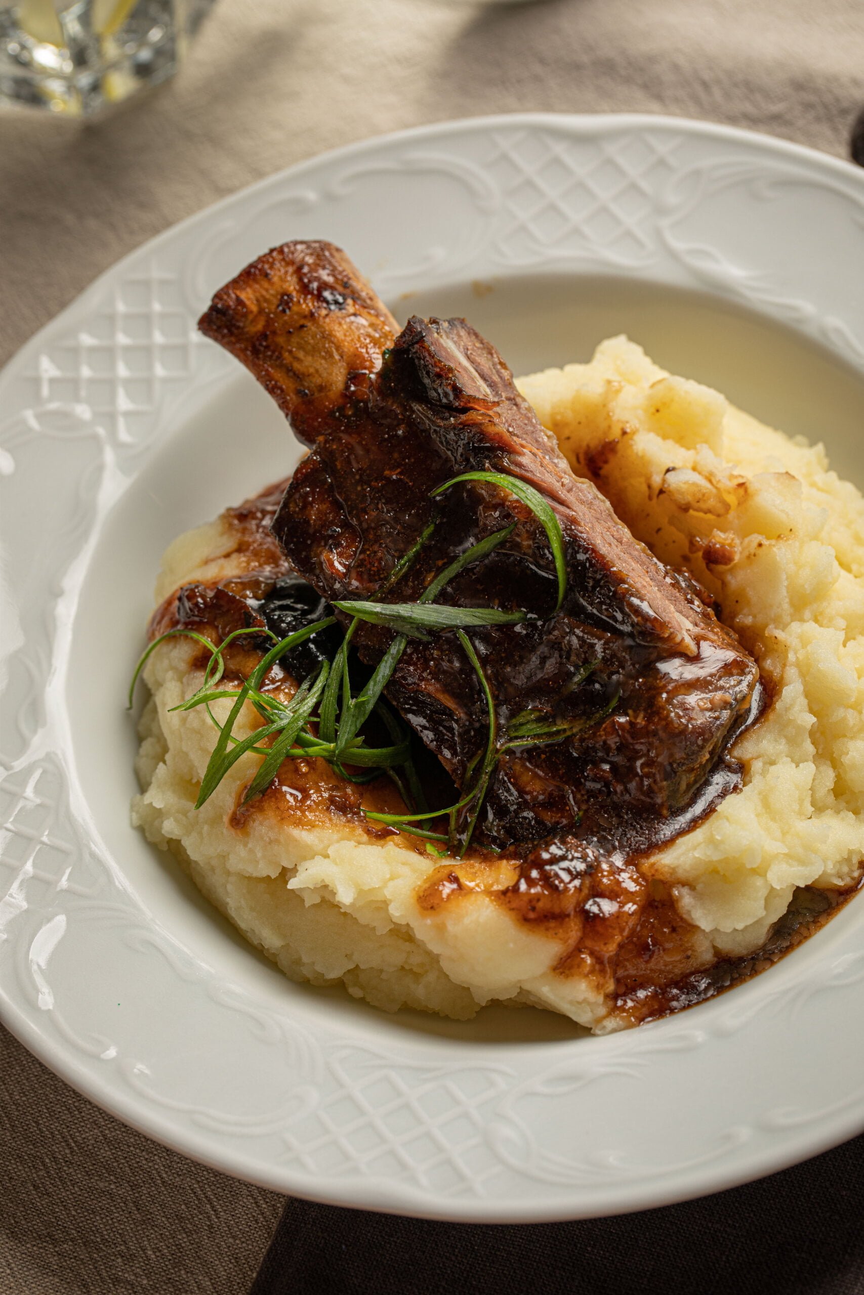 שדירת צלעות בקר צלויות ברוטב יין אדום וציר בקר, עם בצלצלי שאלוט ופטריות.